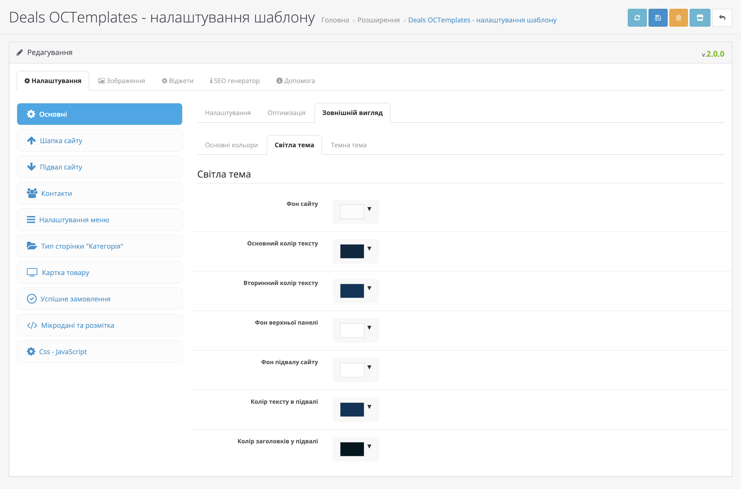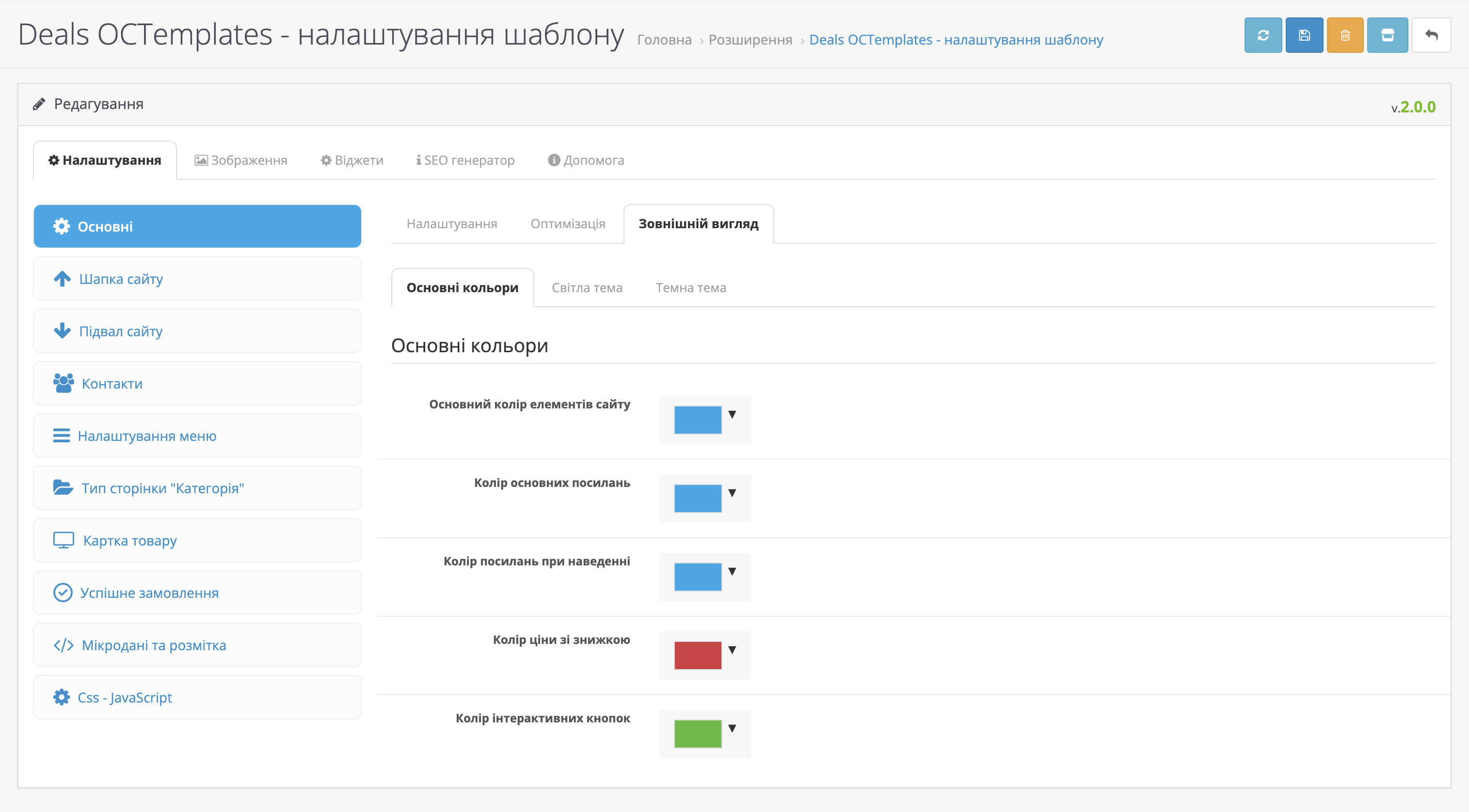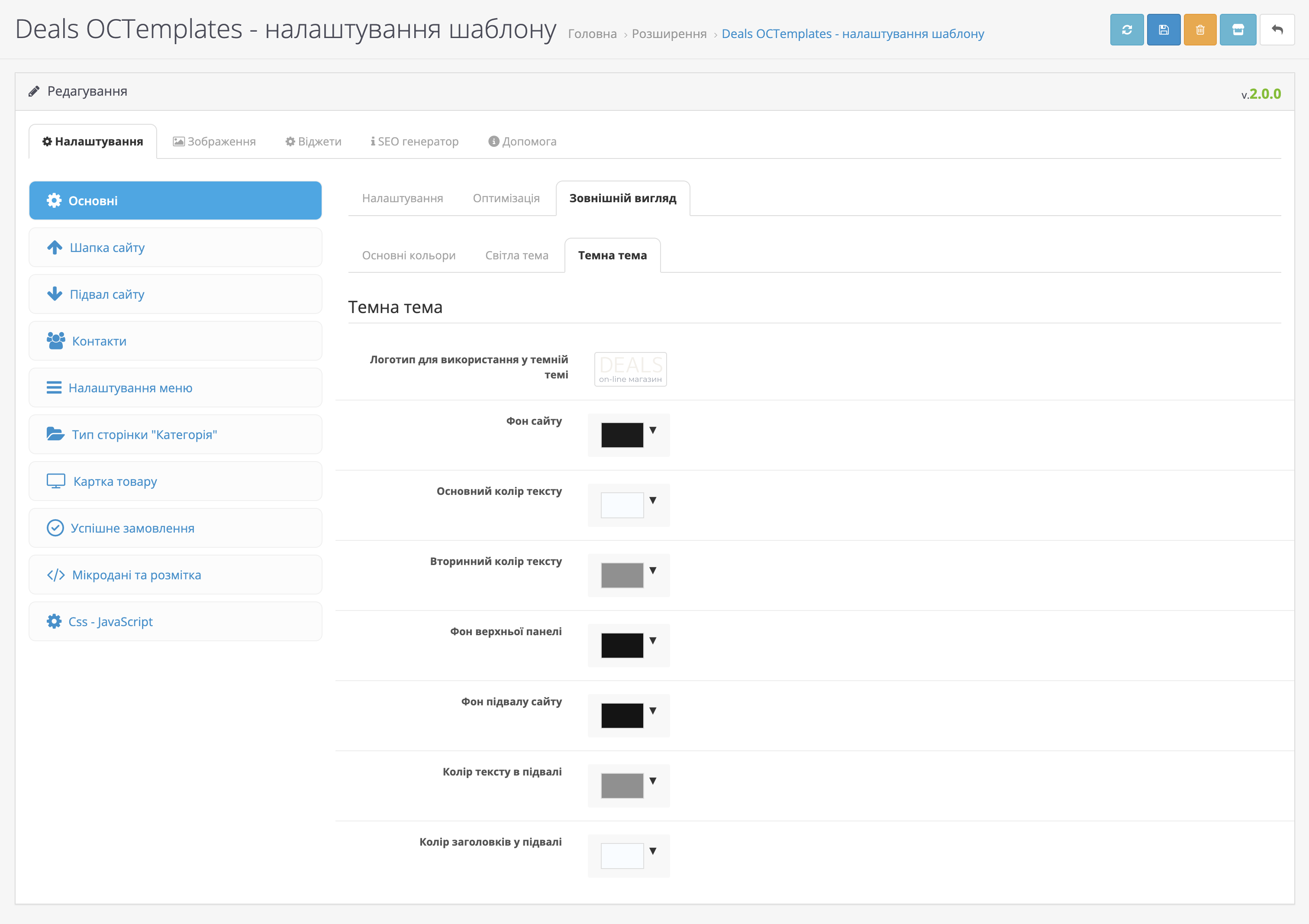 Модуль "Deals OCTemplates - налаштування шаблону" містить основні налаштування шаблону, які зручно структуровані за вкладками.